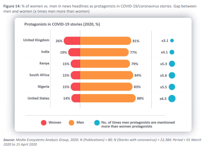 The study, The Missing Perspectives of Women in COVID-19 news, was conducted in India, Kenya, Nigeria, South Africa, the UK, and the US, by the international audience strategy consultancy, AKAS. In one of the chapters, they analyzed three groups of women coverage in news: as experts, sources of news, and story protagonist.