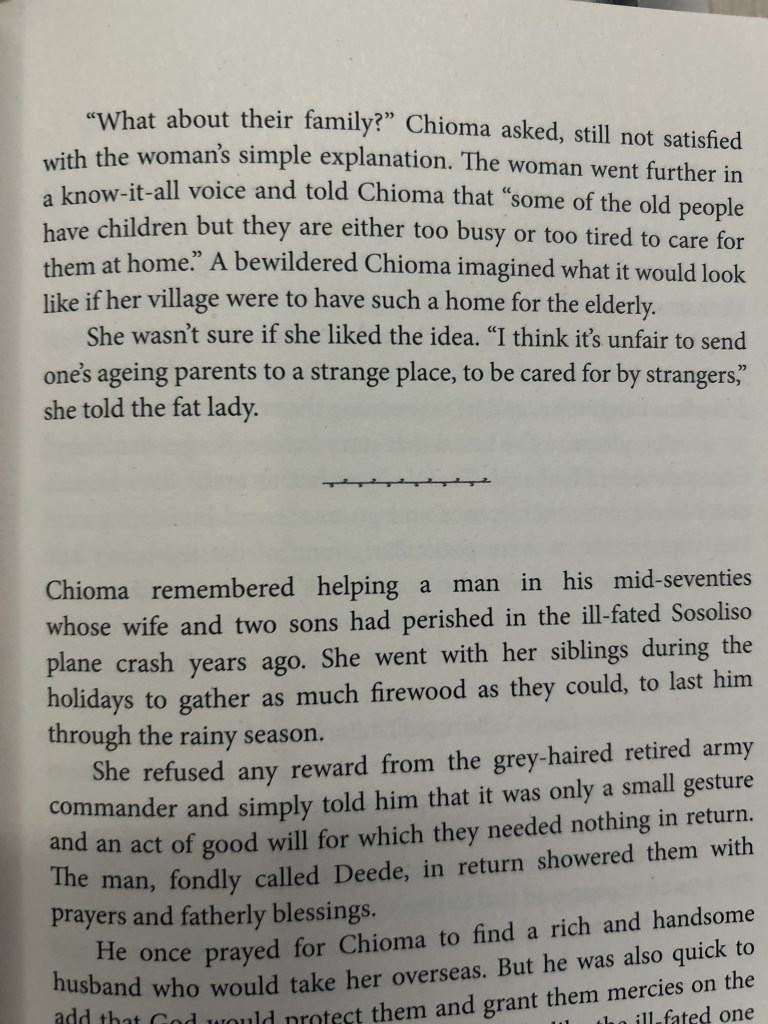 H: This is, unfortunately, the reality of many people who move, for example, from societies that are communal-based. Chioma, the main character in this book, comes from a place where the community role is very important. However, while she is based in Italy, she realises that she misses, amongst other things, the sense of feeling like a part of the community where she lives.