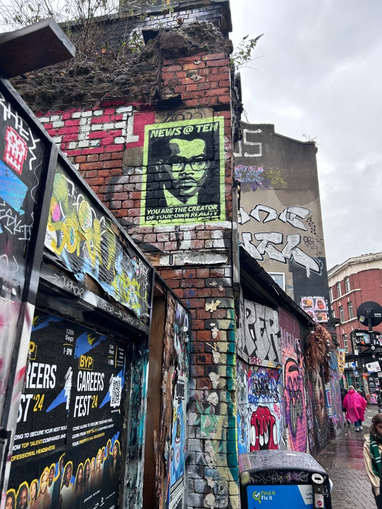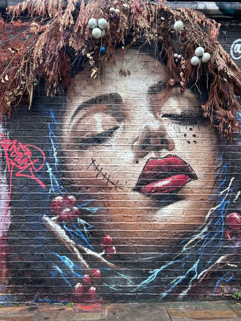 A day before the carnival, we headed to Brick Lane to see Three Monkeys, located on the wall of the train track in this colorful neighborhood. I was thrilled to see their work on the street rather than in an exhibition. While walking toward the location, it started to rain—as is typical in London. Diego, one of my friends, didn’t want to get wet, so he stayed in a coffee shop with another friend. I borrowed his coat and went down the street to look for the art piece. I found it and was excited to see it, having just been revealed weeks before.